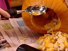 Use and ice cream scoop to remove the seeds. This gives you a good handle so you can scrape out the sides, and also helps you pull out the seeds. Don’t be afraid to get your hands in there and pull them out either. The mess is half the fun!
